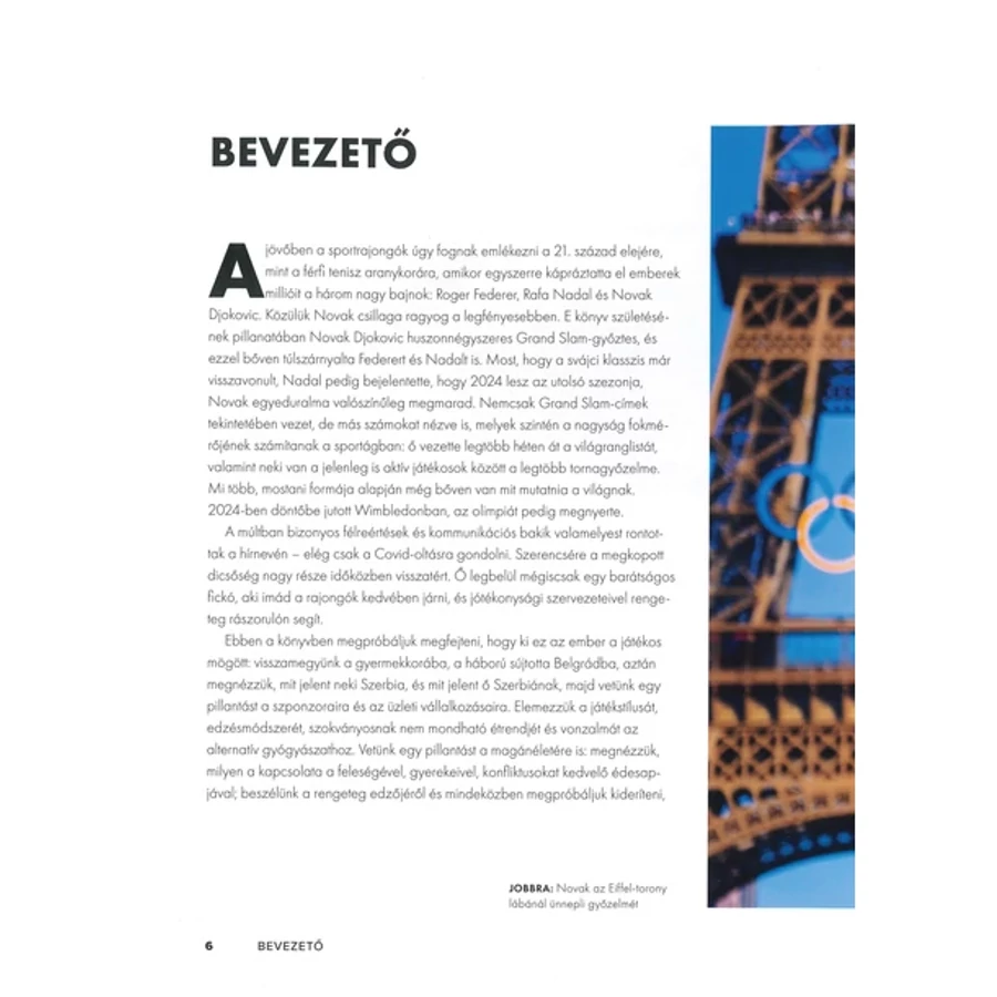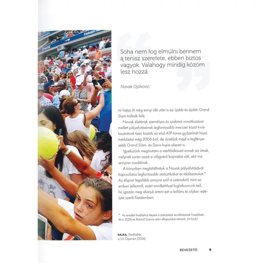 A Novak Djokovic – Minden idők legnagyobbja részletesen foglalkozik a szerb világklasszis játékstílusával, edzésmódszerével, családi életével, üzleti érdekeltségeivel és a pályafutásával kapcsolatos ellentmondásos döntéseivel, beleértve többek között a koronavírus elleni oltás visszautasítását. A könyvben helyet kap tíz fontos mérkőzés, melyek mérföldkőnek számítanak Djokovic karrierjében, emellett izgalmas táblázatok és statisztikák segítik az olvasót, hogy még jobban megismerhesse kedvencét.